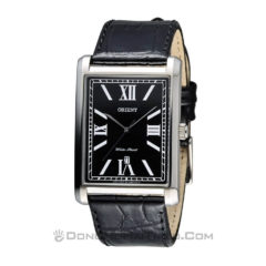 Đồng hồ Orient FUNEM002B0 có niềng hình chữ nhật kim loại bao quanh nền đen mặt số cùng kim chỉ và vạch số được phủ màu trắng phản quang nổi bật, dây đeo bằng da vân đen lịch lãm nam tính.