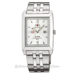 Đồng hồ nam tính Orient SNQAA002WE dành cho phái mạnh với mặt chữ nhật nền trắng có viền đen, 3 kim chỉ đơn giản còn có 1 lịch ngày, mặt cứng khoáng chịu lực và chất liệu là thép không gỉ.